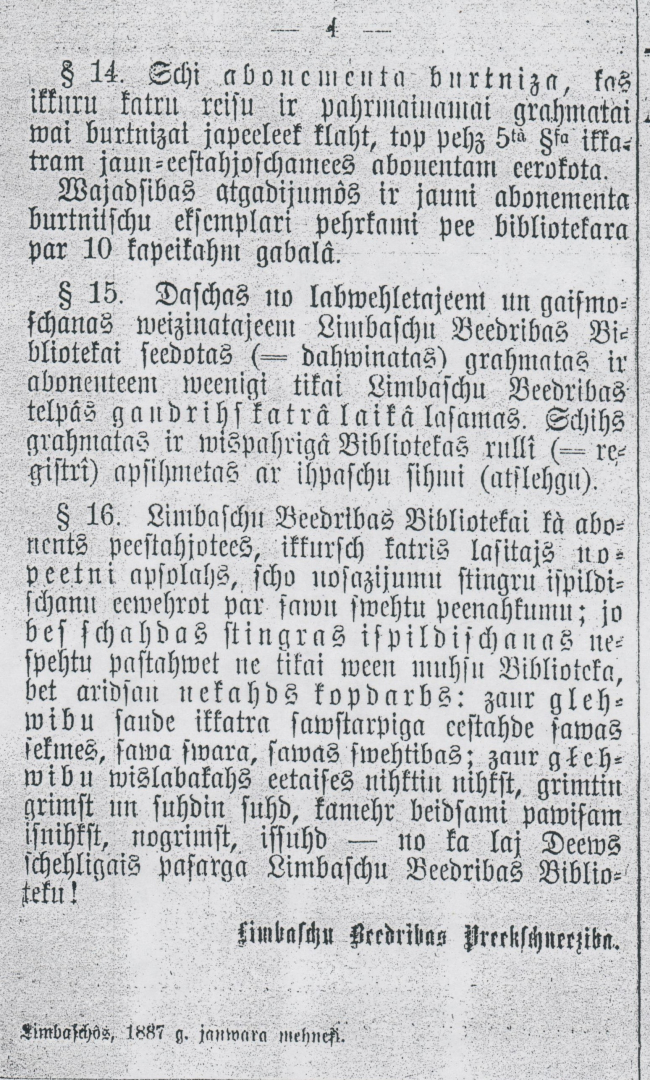 Baumaņu Kārlis, būdams liels aktīvists, pirmais izstrādāja bibliotēkas lietošanas nosacījumus, uzsverot kārtības un atbildības nozīmi. Grāmatā “Mazi vārdi lielai dzīvei. Pārdomas un piezīmes par Baumaņu Kārli” Mārtiņš Brems citē viņa vārdus: “Limbažu biedrības bibliotēkai, kā abonents piestājoties, ikkurš katrs lasītājs nopietni apsolās šo nosacijumu stingru izpildīšanu (…) jo bez šādas stingras izpildīšanas nespētu pastāvēt ne tikai vien mūsu bibliotēka, bet arīdzan nekāds kopdarbs: caur gļēvību zaudē ikkatra savstarpīga iestāde savas sekmes, sava svara, savas svētības; caur gļēvību vislabākās ietaisnes nīktin nīkst, grimtin grimst un zūdin zūd, kamēr beidzot pavisam iznīkst, nogrimst, izzūd - no kā lai dievs žēlīgais pasargā Limbažu biedrības bibliotēku.” Iespējams, tieši šis Baumaņu Kārļa teiktais veidojis tik stabilu pamatu bibliotēkai Limbažos.