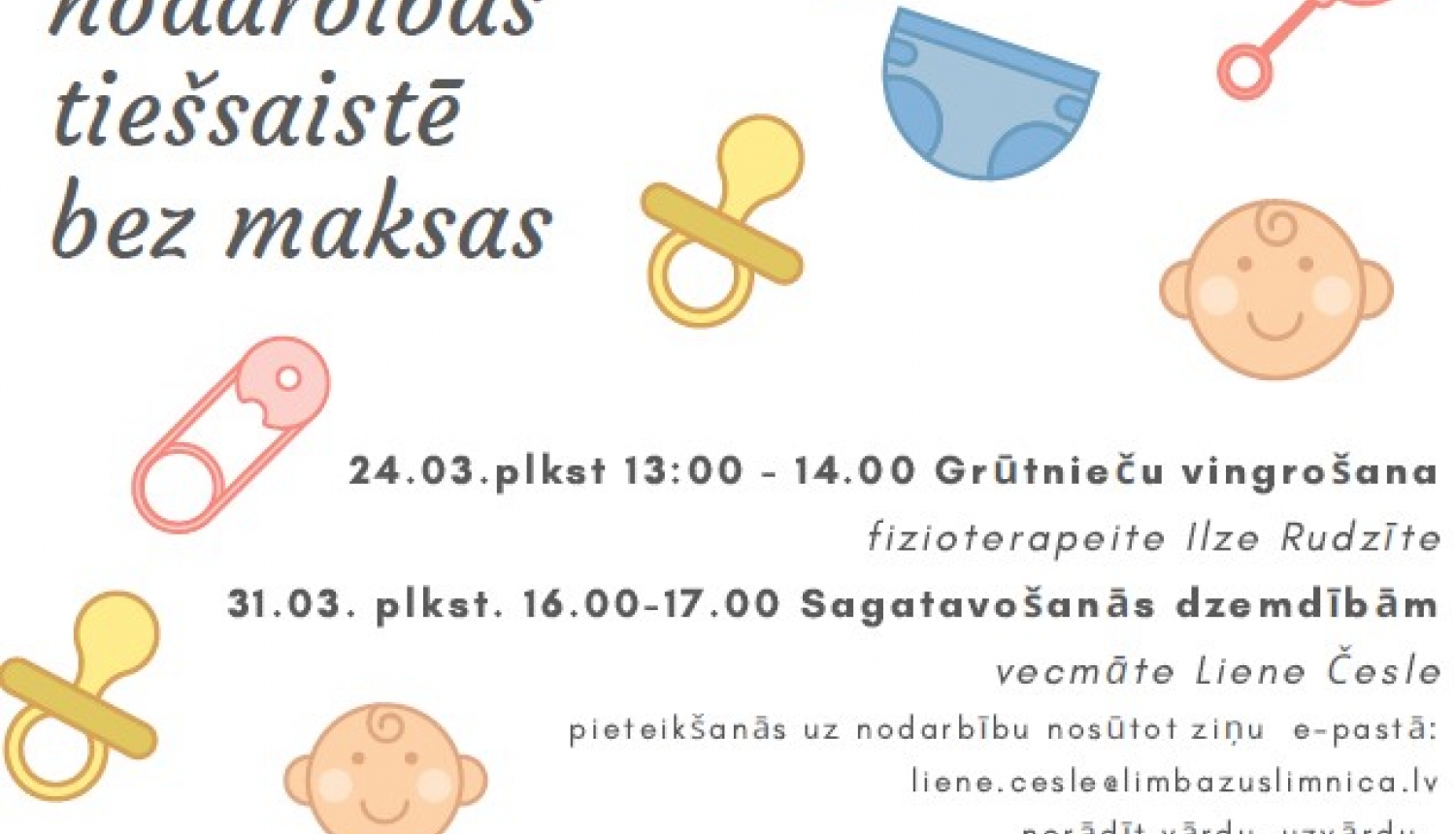 Sāksim jau martā! Pirmās nodarbības plānotas š.g. marta mēnesī, 24.martā plkst.13:00-14:00 pirmsdzemdību nodarbība grūtnieču vingrošana, kuru vadīs sertificēta fizioterapeite Ilze Rudzīte, 31.martā plkst. 16:00-17:00 pirmsdzemdību nodarbība - sagatavošanās dzemdībām, sertificētas vecmātes Lienes Česles pavadībā. Pieteikšanās uz nodarbību nosūtot ziņu e-pastā: liene.cesle@limbazuslimnica.lv (norādīt vārdu, uzvārdu un e-pasta adresi uz kuru nosūtīt piekļuves saiti). Nodarbības notiks izmantojot ZOOM platformu.