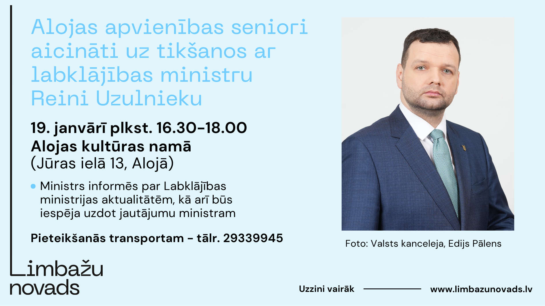 Alojas apvienības seniori aicināti uz tikšanos ar labklājības ministru Reini Uzulnieku 19. janvārī plkst. 16.30-18.00 Alojas kultūras namā (Jūras ielā 13, Alojā)