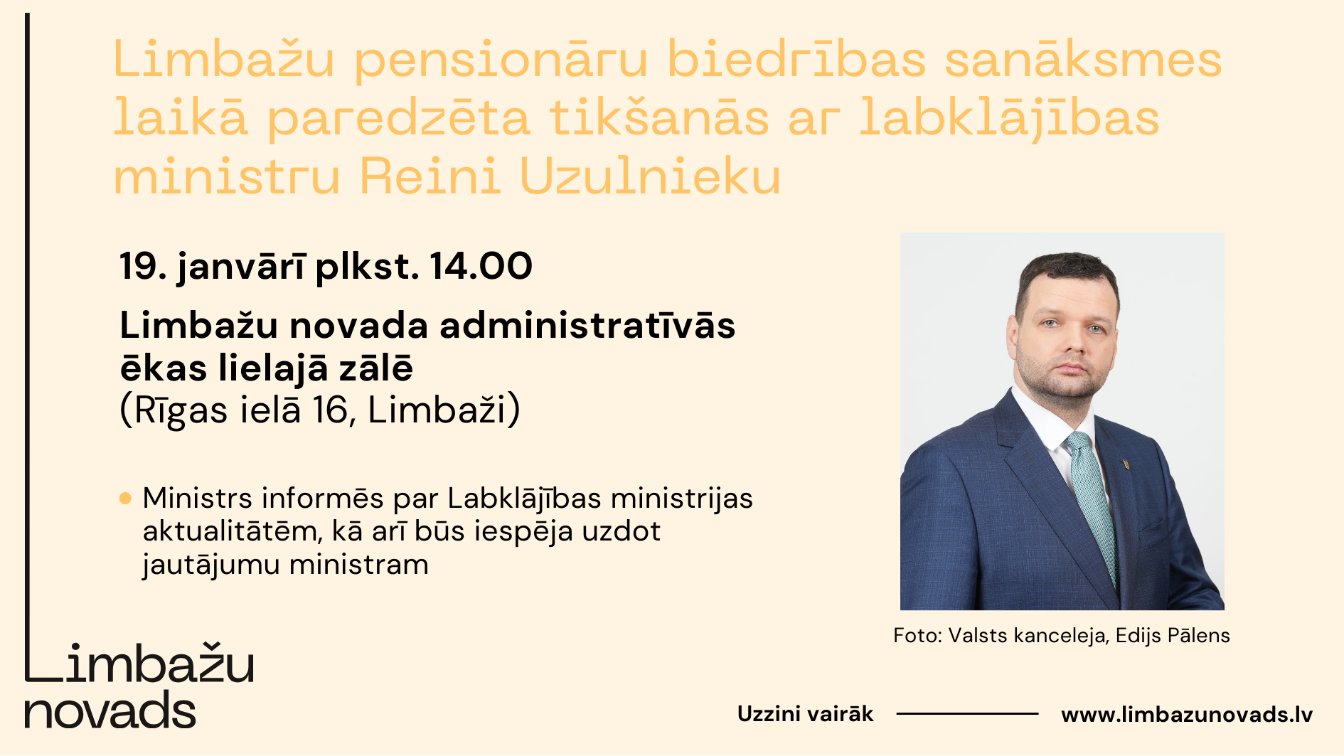Limbažu pensionāru biedrības sanāksmes laikā 19. janvārī plkst. 14.00 paredzēta tikšanās ar labklājības ministru Reini Uzulnieku, Limbažu novada administratīvās ēkas lielajā zālē (Rīgas ielā 16, Limbaži).