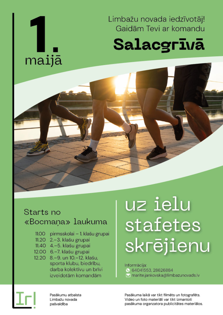 Šajā svētku dienā Salacgrīvā tiek gaidīta ikviena Limbažu novada skolas vai pieaugušo komanda, kur no plkst. 11.00 notiks 1.maija ielu stafetes skrējiens.