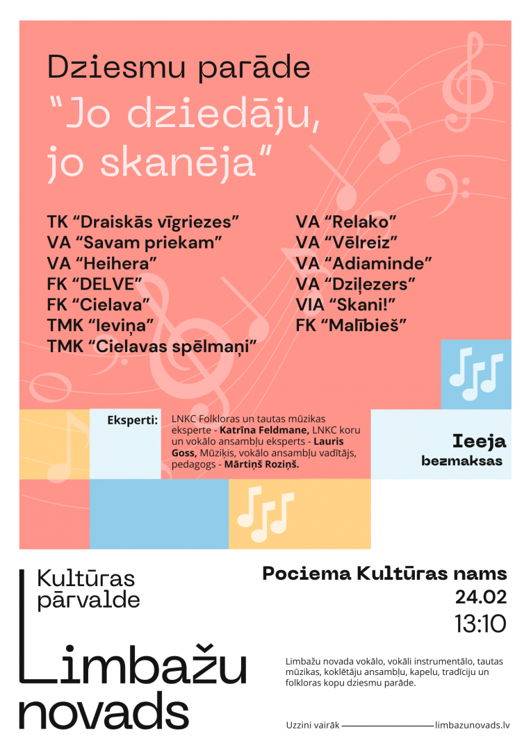 Limbažu novada vokālo, vokāli instrumentālo, tautas mūzikas, koklētāju ansambļu, kapelu, tradīciju un folkloras kopu dziesmu parādes - skates programma “Jo dziedāju, jo skanēja…”