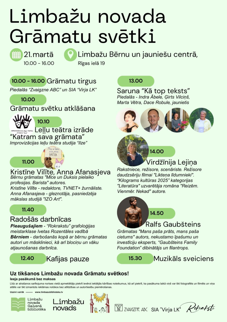 21. martā Limbažu Bērnu un jauniešu centrā visas dienas garumā aicinām baudīt daudzveidīgu un iedvesmojošu programmu gan lieliem, gan maziem. Apmeklētājus gaidīs grāmatu tirgus, leļļu teātra izrāde, tikšanās ar autoriem, radošās darbnīcas, saruna “Kā top teksts”! Šī ir iespēja satikt spilgtas personības no literatūras, mākslas un kultūras pasaules.