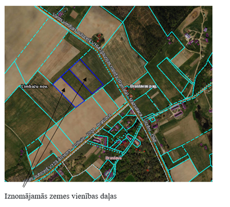 zemes gabaliem Poguļi, Braslavas pagastā, kadastra apzīmējums 6644 001 0055 3,4 ha platībā, lauksaimnieciskai ražošanai. Nomas maksa gadā - EUR 299,20 bez PVN.